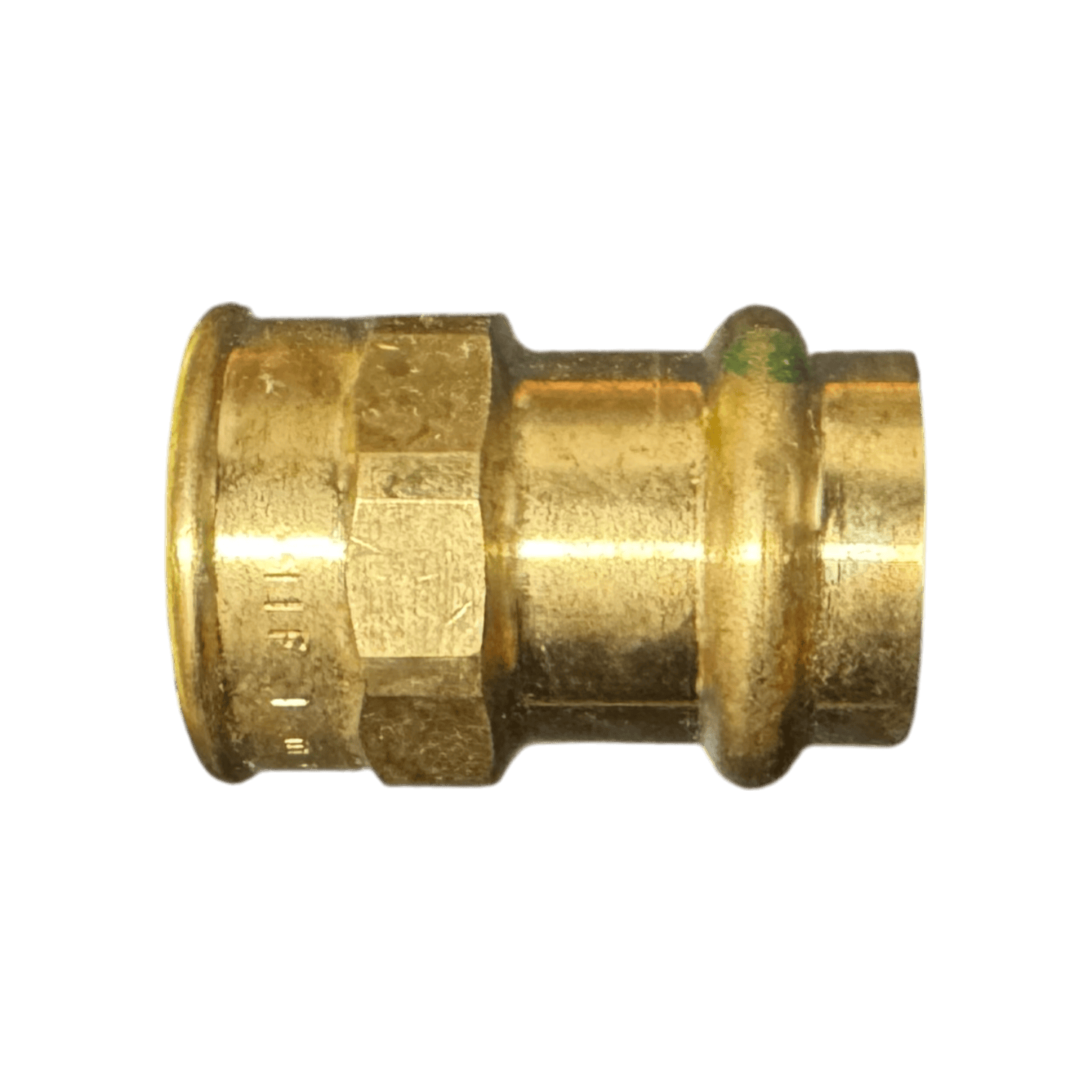 A 1/2 in brass press x female NPT adapter used to transition from press copper piping to a threaded connection. Ideal for valves, gauges, and threaded components in plumbing and mechanical room installs.